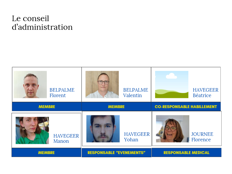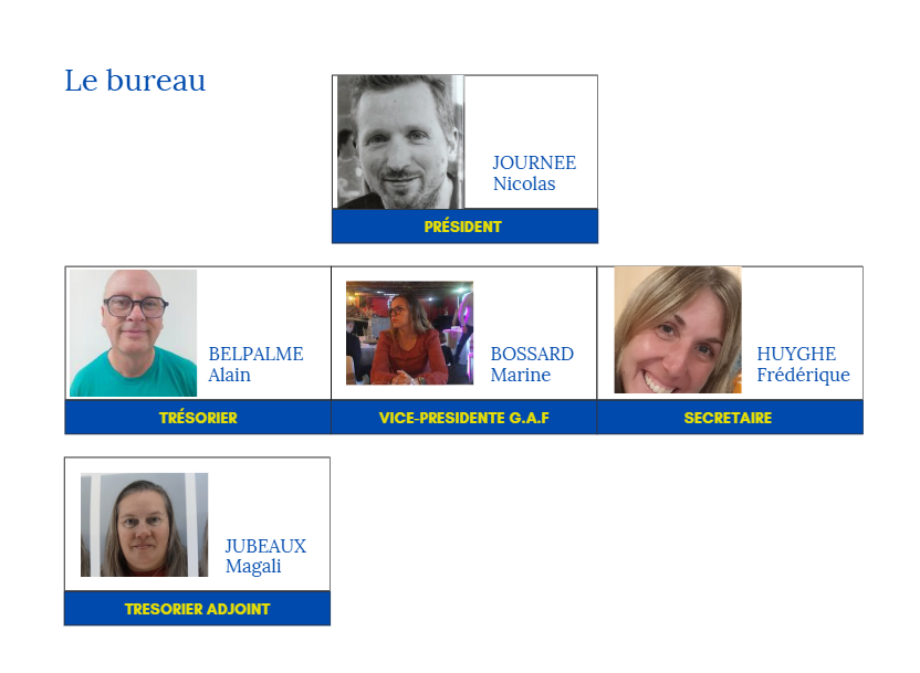 Les membres du conseil d'administration sont élus pour un mandat de 3 ans (renouvelable) - les membres composant le bureau sont élus pour une durée de 1 ans (renouvelable). Tous les membres du conseil d'administration sont bénévoles